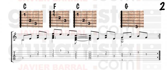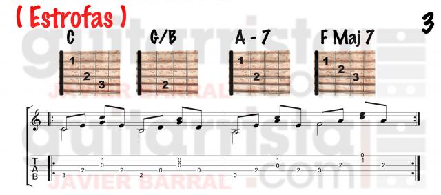 Tendremos que tener en cuenta el primer acorde de F y el ultimo acorde de C del estribillo que van anticipados.
